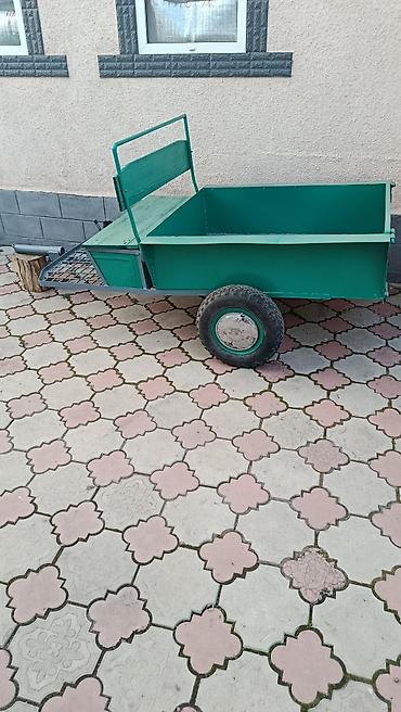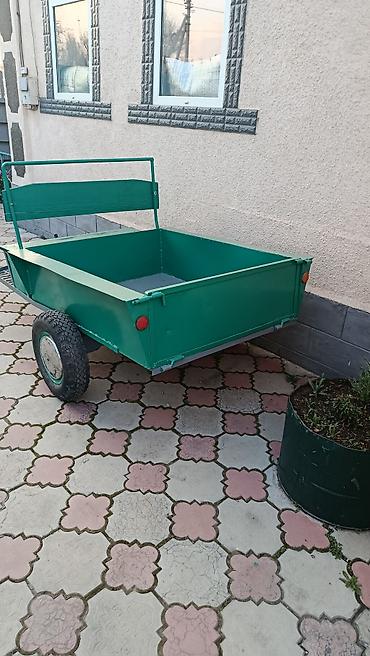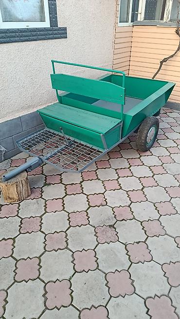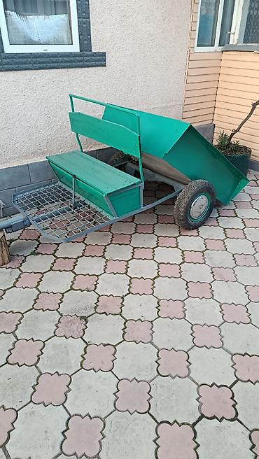 - Двухколесный прицеп с откидным/самосвальным кузовом. Кузов поднимается механическим домкратом-винтом, удобен для выгрузки сыпучих материалов.