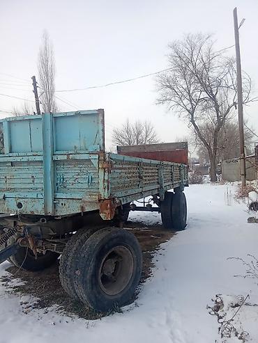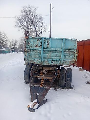 Прицеп двухосный, длина борта около 6–7 м. Платформа металлическая, бортовая, с трехсторонней разгрузкой: откидные боковые и задний борта на петлях. Усиленная рама, рессорная подвеска, дышло под буксирную серьгу. Пневматическая магистраль с витым шлангом для подключения тормозной системы трактора. Колеса спаренные сзади, передняя ось одинарная.