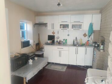 - Просторная кухня: линейный гарнитур с верхними и нижними шкафами, столешница с раковиной, вытяжка, рабочая фартук-плитка. Есть место под бытовую технику. Рядом сохранилась кирпичная печь/ниша под отопление или готовку.