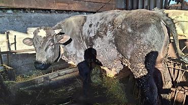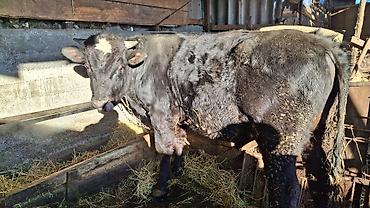 Бык (молодняк мясного направления), черной масти с белыми отметинами. Рога короткие, уши с бирками. Содержится на привязи в крытом стойле, кормление сеном и силосом из кормушки, доступ к воде. Тело...