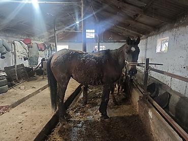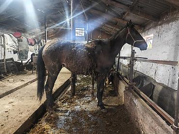Лошадь темной масти с отметиной на лбу (звездочка), стоит на привязи в конюшне. Высокая холка, крепкий костяк, длинные ноги, пропорциональное телосложение. Профиль головы прямой, уши подвижные, спокойный взгляд. Хвост и грива густые, копыта крупные. На фото видна поилка/кормушка вдоль стены, животное спокойно переносит стоило и привязь, адекватно реагирует на людей в проходе. Подходит для работы под седлом и упряжью; в помещении рядом хранятся седла и вальтрапы стандартных размеров. Возможна эксплуатация в хозяйстве: упряжные работы, прогулочные выезды, обучение начинающих на плацу. Лошадь непугливая, стоит ровно, уверенно держит корпус, хорошо переносит чистку и уход в стоиле.
