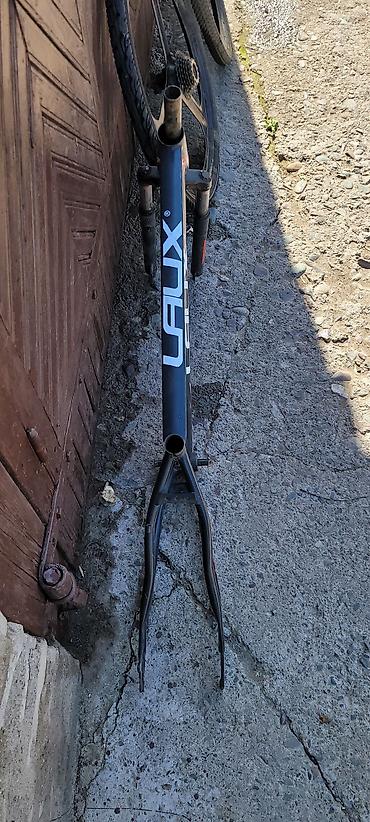 - Рама LAUX (алюминиевая, хардтейл, под дисковые тормоза). Дропауты под быстросъём/ось, крепления под задний переключатель, внутренние/внешние направляющие для тросов. Размер визуально средний (ориентируйтесь по фото геометрии).