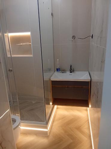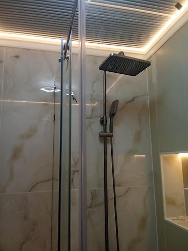 - Ванные комнаты и санузлы: монтаж душевых кабин с перегородками из закалённого стекла, установка сантехники, встраиваемые ниши с подсветкой, укладка крупноформатной плитки/керамогранита.