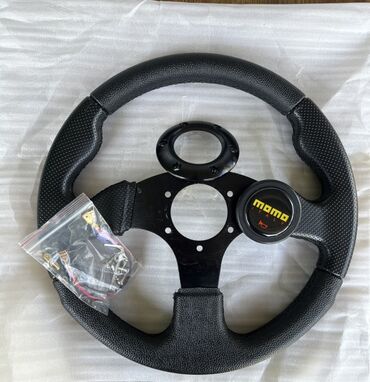 Спортивный руль MOMO (реплика/тюнинг), трехспицевый - Диаметр: около 350 мм (классический размер для тюнинга и дрифта) - Материал обода: обтянутый кожзам/эко‑кожа, с желтыми метками «ноль» - Спицы...