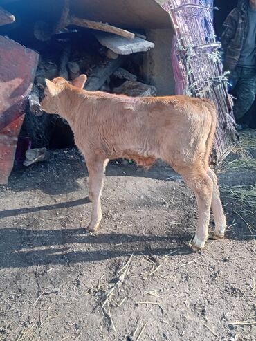 Теленок, рыжий окрас. Молодое животное на фото: крепкий корпус, ровные ноги, аккуратная голова и уши, короткая светлая шерсть. Спина прямая, хорошо развитые конечности, активный и подвижный. Подходит для дальнейшего откорма или формирования маточного поголовья. Натуральное содержание на подворье.
