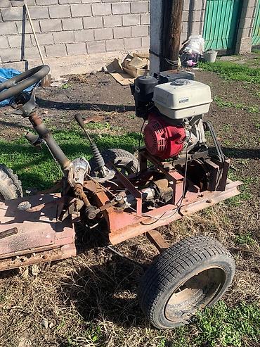 Самодельный мини-трактор/мотоблок на раме с сиденьем и рулевым управлением. Характеристики и устройство: - Бензиновый одноцилиндровый двигатель с ручным стартером (тип Honda/аналог), установлен сл...