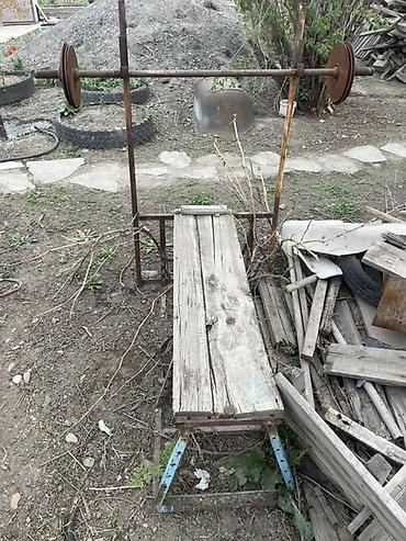 - Материалы: стальной каркас и гриф; диски из металла; лавка из досок на стальном основании.
