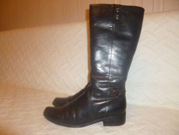 Женские высокие сапоги, классические черные. - Материал: гладкая черная кожа (внешняя часть). - Фасон: прямое голенище до колена. - Носок: аккуратный округло-заостренный. - Подошва: прочная, с защ...