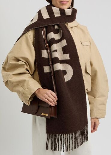 Палантин/шарф Jacquemus с крупным логотипом - Формат: широкий палантин, можно носить как шарф, накидку или плащ-накидку. - Цвета: темно-коричневый с контрастным белым логотипом; - Материал: мягко...