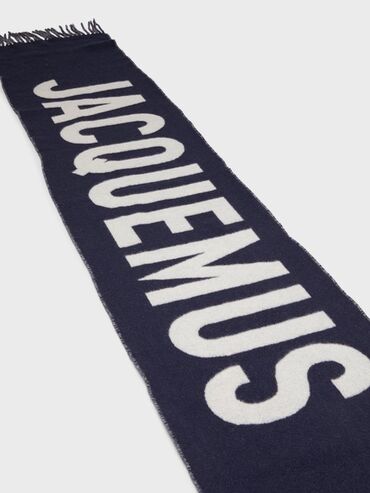 Шарф Jacquemus с крупным логотипом - Тип: тёплый шарф с бахромой - Цвет: тёмно‑синий с контрастным белым логотипом JACQUEMUS по всей длине - Материал: шерсть (на бирке — Virgin Wool) - Фактура: пл...