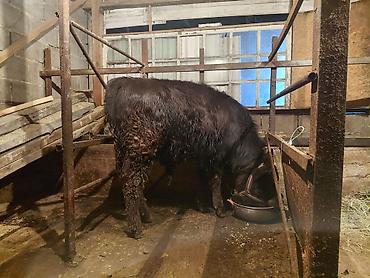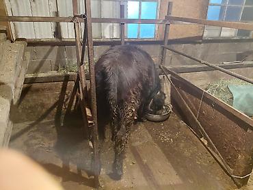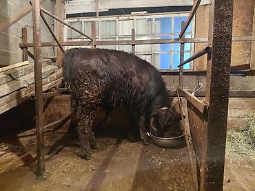 - Кормление: на фотографиях — на привязи, поение и кормление из металлической кормушки; в рационе — сено, зерносмесь/мешанка.