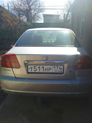 Honda Civic седан (примерно 2001–2003 г.в.), серебристый цвет. Основные характеристики: - Кузов: 4-дверный седан. - Двигатель: бензиновый рядный 4-цилиндровый. - Трансмиссия: автомат. - Привод: пе...