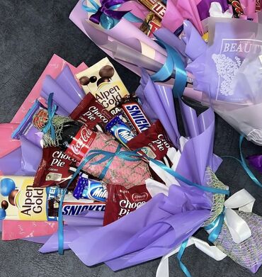 - Ассорти-букеты с популярными лакомствами: Snickers, Milky Way, KitKat, Alpen Gold, Choco Pie, Timi и др., возможны акценты в виде мини-бутылочки Coca-Cola.