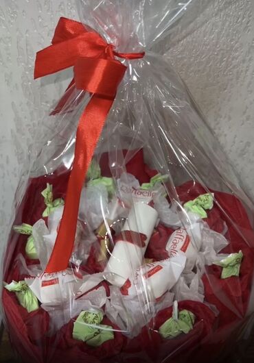 - Подарочные корзинки/букеты в прозрачной пленке с бантом, с конфетами Raffaello и декоративными элементами.