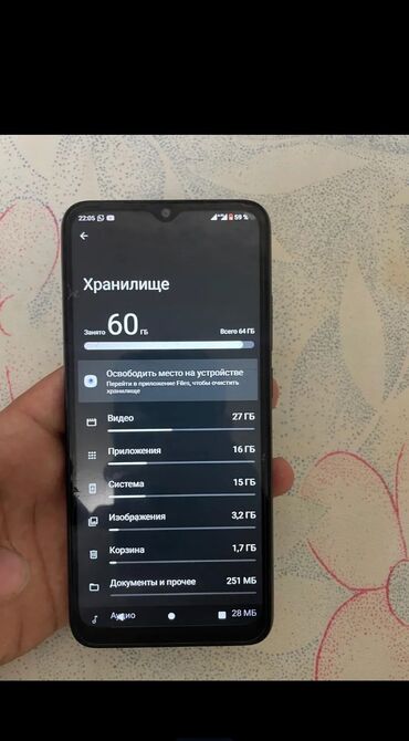 - Память: 64 ГБ встроенной памяти (на скриншоте отображается «Всего 64 ГБ», занято ~60 ГБ).