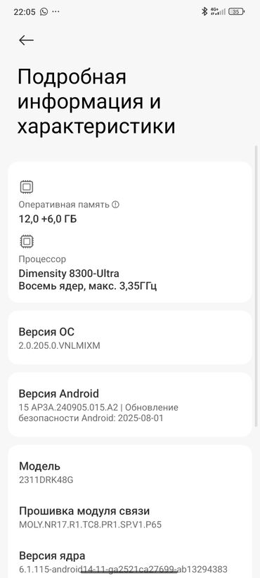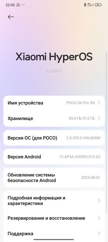 POCO X6 Pro 5G, глобальная версия HyperOS 2.0.205.0 (Android 15, патч безопасности 2025‑08‑01). Память: 12 ГБ оперативной + 6 ГБ расширения, хранилище 512 ГБ (доступно ~59,4 ГБ занято). Процессор: MediaTek Dimensity 8300‑Ultra, 8 ядер, до 3,35 ГГц. Модель устройства: 2311DRK48G.