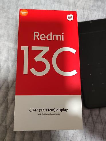 - Оригинальная коробка Redmi 13C с указанием спецификаций (NFC, дисплей 6.74", 90 Гц).
