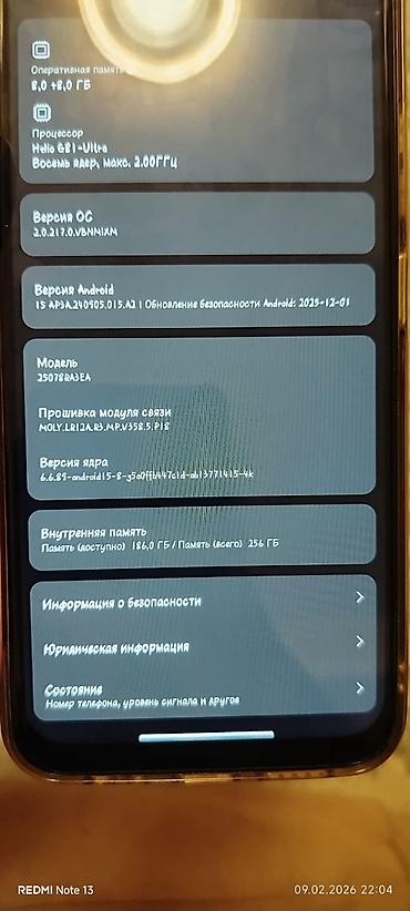 Смартфон Redmi 15C, черный Ключевые характеристики: - Память: 8 ГБ оперативной, 256 ГБ встроенной (доступно ~29,9 ГБ из 256 ГБ по скриншоту системы) - Процессор: MediaTek Helio G81-Ultra, 8 ядер, ...