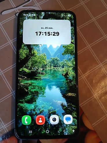 - Операционная система Android с интерфейсом One UI: на экране виджет часов и стандартные приложения Samsung (Телефон, Контакты, Камера, Сообщения).