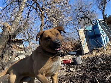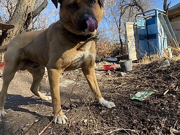 Кобель средних/крупных размеров, короткошёрстный, рыжего окраса с белыми отметинами на груди и лапах. Плотное телосложение, мощная шея, широкая грудь, крепкие лапы. Уши полустоячие, хвост средний. На собаке прочный широкий тканевый ошейник защитного (хаки) цвета с прошивкой.