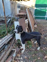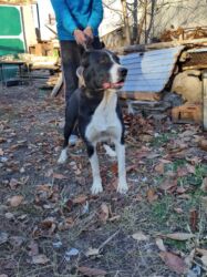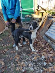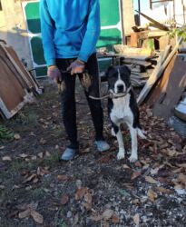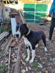 Самка Алабай 1год. Собака крупного/средне‑крупного размера, черно‑белого окраса. Мускулистое телосложение, глубокая грудь, широкая голова, крепкие лапы. На фото — короткая гладкая шерсть, белая грудь и лапы, белая проточина на морде. Уши натуральные, хвост естественный. Носит ошейник и спокойно стоит на поводке/цепи, уверенно держится рядом с человеком. Насторожна к происходящему. Подойдет как дворовая/охранная собака для частного дома или хозяйства. Требует активных прогулок, надежной привязи/вольера и базовой дрессировки.