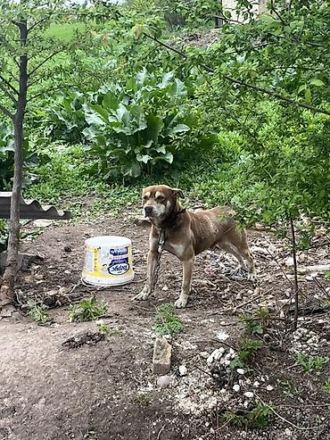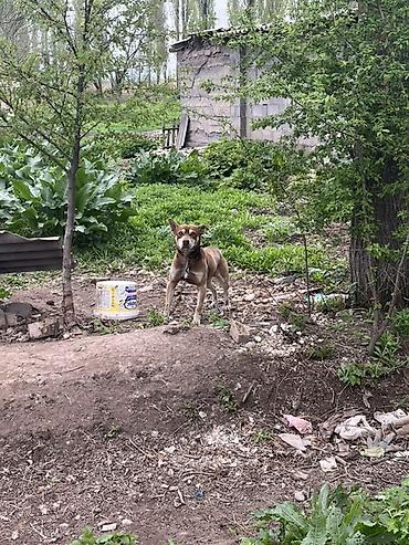 Собака среднего размера, короткошёрстная, рыжего окраса с белыми отметинами на груди и лапах. Пропорциональное телосложение, крепкие лапы, стоячие уши, выразительные карие глаза. На фото — ошейник и прочная цепь с карабином.