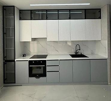 цена без мойка 12000 с мойкой 13500 доставка по городу бишкек 500 Кухонный гарнитур с серыми фасадами, имитирующими бетонную поверхность, и столешницей с рисунком под белый мрамор. Верхние шкафы с ...