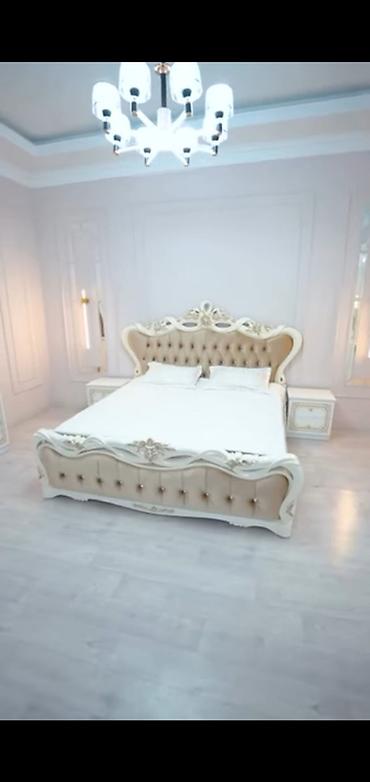 - Цвет: молочно‑белый с золотыми вставками; обивка кровати — бежевый бархат/велюр с декоративными пуговицами.