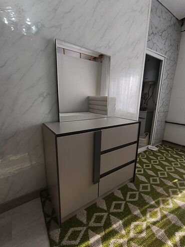- Комод с большим настольным зеркалом: три выдвижных ящика + отделение с дверцей.