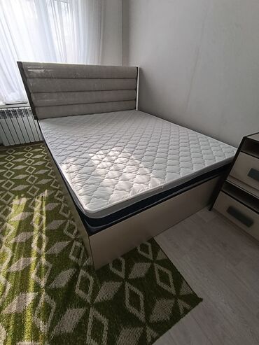 - Кровать двуспальная с мягким широким изголовьем из горизонтальных валиков; высокое основание под матрас. На фото — матрас стандартной высоты.