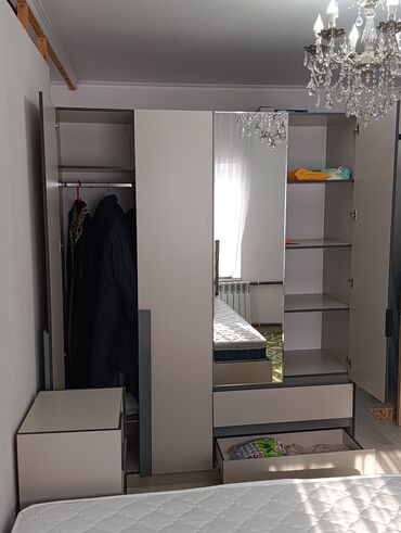 - Шкаф распашной с зеркалом: левая секция с полноценной штангой для одежды, правая — с полками для хранения; внизу — два выдвижных глубоких ящика.