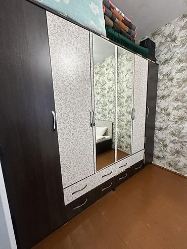- Шкаф-купе/распашной большой, 5‑дверный: центральные створки с зеркалами, боковые — с декоративным светлым узором. Внизу — ряд выдвижных ящиков с металлическими ручками. Вместительная секция для плечиков, полки для белья, дополнительные отсеки.