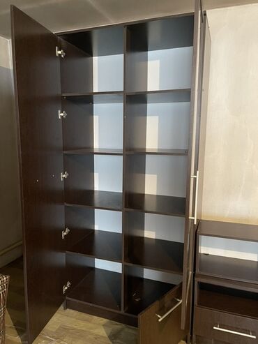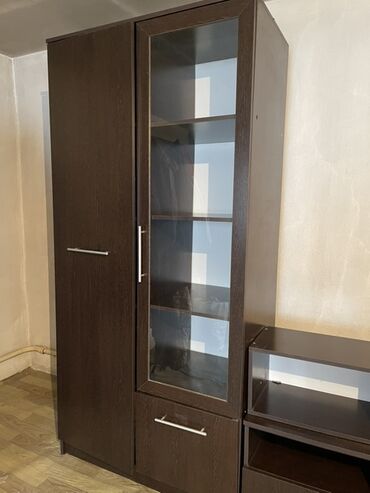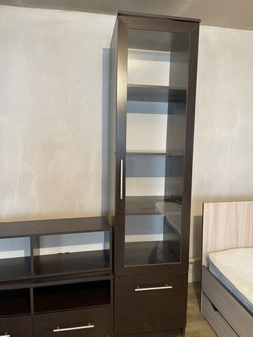 ДСПСервант. Секция корпусной мебели с отделениями для хранения одежды и полками для книг или декоративных предметов. Состоит из шкафа с полками, шкафа-витрины со стеклянными дверцами и выдвижного модуля с ящиками и открытыми полками. Отделка выполнена в темном цвете. Подойдет для гостиной или спальни. В хорошем состоянии. Самовывоз с Кара-Балты