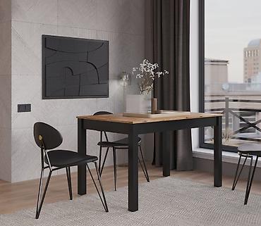 - Обеденный/рабочий стол: прямоугольная столешница под натуральное дерево, массивная рама и ножки из металла, окрашенные в матовый чёрный цвет. Лаконичный дизайн подходит для кухни, гостиной или домашнего офиса. Устойчивая конструкция, визуально лёгкий силуэт, легко сочетается с современными интерьерами.