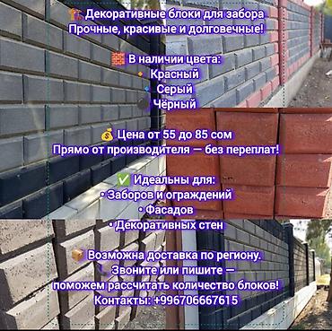- Декоративные блоки для заборов: цвета красный, серый, чёрный; цена от 55 до 85 сом