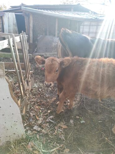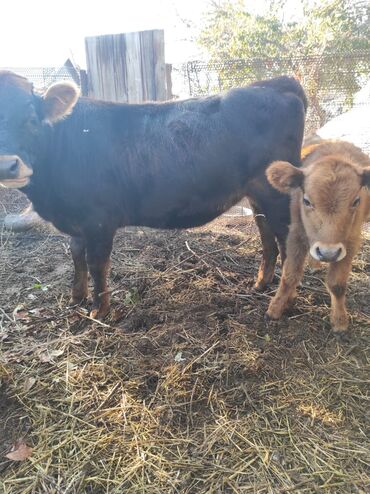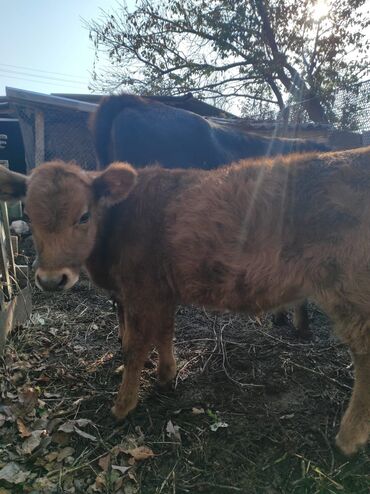 - В наличии молодые животные: один тёмный (чёрно-рыжий) телёнок и один рыжий пушистый телёнок.