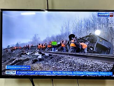 Телевизор Panasonic, диагональ экрана примерно 40–43". Плоская панель с тонкими рамками, настенное крепление (VESA) установлено. Изображение четкое, яркая подсветка, хороший угол обзора. Подходит для просмотра эфирного ТВ и новостей — на фото показан прием телеканала «Россия РТР» (Вести).