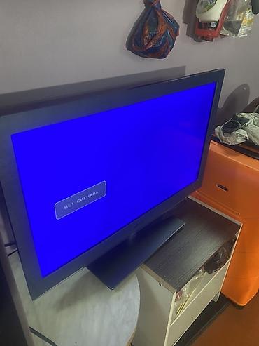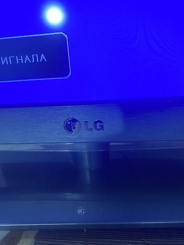 - Модель 1: LG ЖК-телевизор на подставке. Диагональ ориентировочно 32–37". Экран с матовым покрытием, рамка темно-серая. На экране отображается сообщение «Нет сигнала» — питание и подсветка работают. Корпус с центральной тумбовой подставкой. Подходит для подключения приставки/медиаплеера/консоли через стандартные входы.