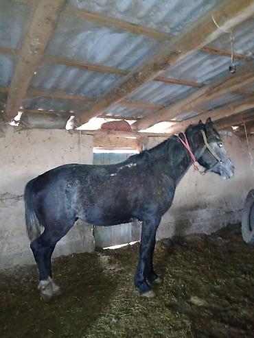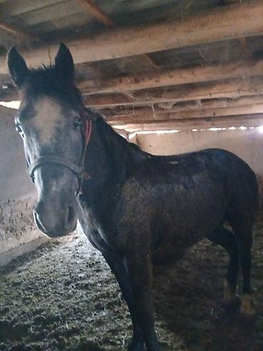 Представляем темную лошадь, стоящую в стойле. Животное имеет темный окрас с заметными серыми или белыми отметинами на морде и теле. На голове надета простая уздечка или недоуздок. Лошадь выглядит спокойной и внимательной, стоя на подстилке из соломы или опилок. Подходит для различных сельскохозяйственных или личных нужд.