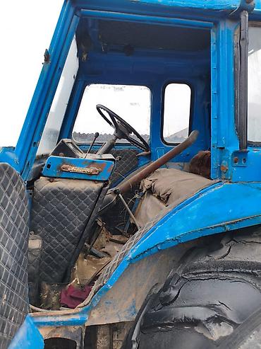 Трактор колесный синего цвета, класс МТЗ/ЮМЗ (ориентир по габаритам и кабине). Кабина закрытая, металлическая, с остеклением по периметру и люком сверху. Передняя ось — неведущая, рулевая; задние колеса — крупногабаритные с сельскохозяйственным протектором.