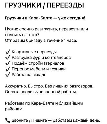 Грузчики Бишкек 24/7 Услуги: - Услуги грузчиков - Квартирные и дачные переезды - Вывоз строймусора - Подъём стройматериалов - Разгрузка фур - Разнорабочие - Экспресс-грузчики Качественно, недорог...