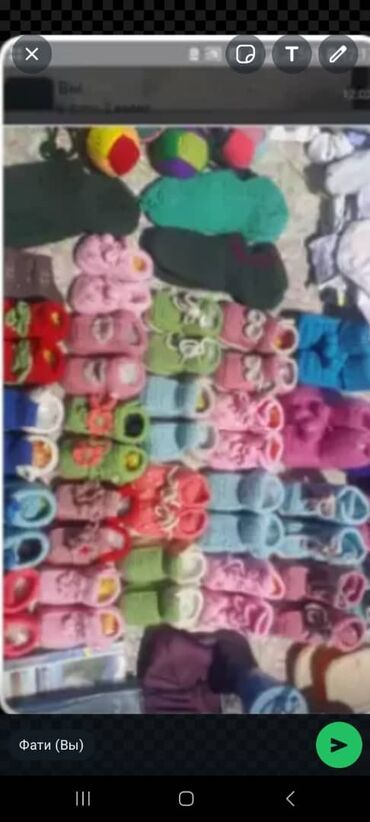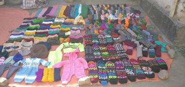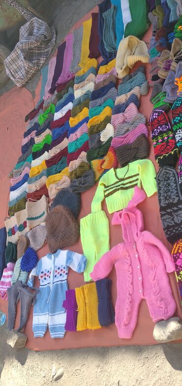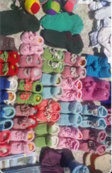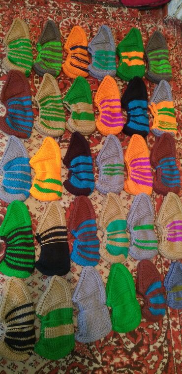 - Носки и следки/тапочки: разноцветные, полосатые, разные толщины пряжи, пары аккуратно перевязаны.