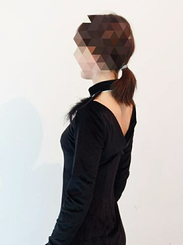 Вечернее платье из бархата, черное. - Силуэт: прямое мини. - Ткань: плотный бархат с мягким матовым блеском. - Рукава: длинные, объемные, с акцентными манжетами на декоративных пуговицах. - Вырез:...