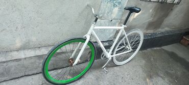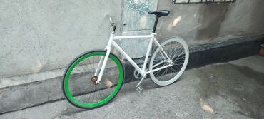 Велосипед с фиксированной передачей, выполненный в белом цвете с яркими зелеными ободами переднего колеса. Модель оснащена прямым рулем, что обеспечивает удобную посадку и контроль. Заднее колесо полностью белое, создавая контраст с передним. Велосипед идеально подходит для городской езды и повседневного использования. рама и руль полностью из алюминия