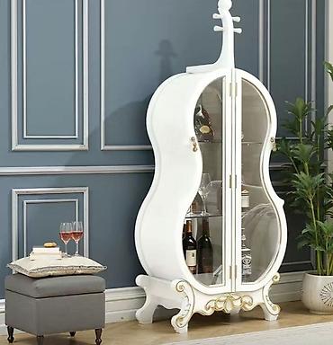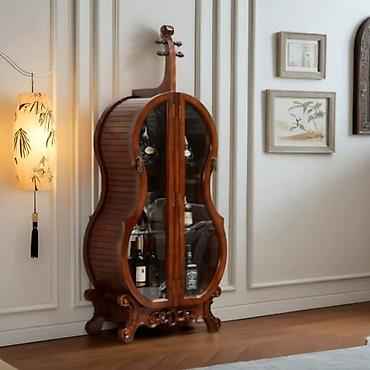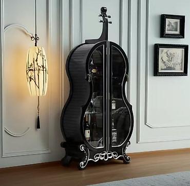 - Дизайнерская напольная витрина с фасадами в очертаниях виолончели — акцентный предмет интерьера для гостиной, кабинета или бара.
