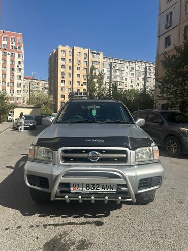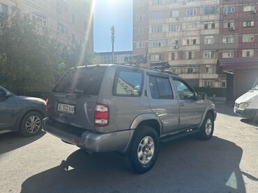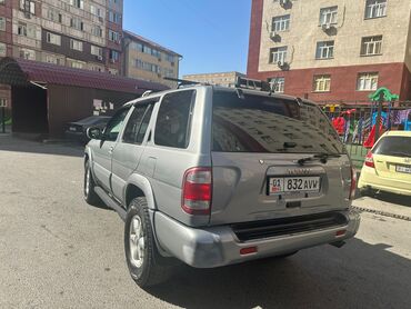 Nissan Terrano/Pathfinder (R50) — пятидверный рамный SUV серебристого цвета. Особенности и оснащение: - Полноразмерный кузов с рейлингами на крыше и багажной платформой. - Передний силовой кенгуря...