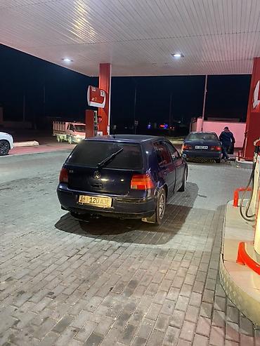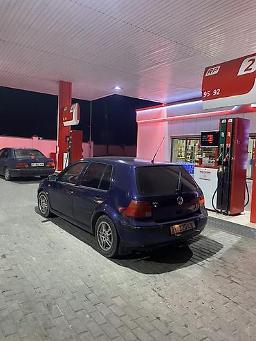 Volkswagen Golf (хэтчбек, 5 дверей), поколение Mk4. Цвет темно‑синий. Номерные знаки: формат KG (на фото). Топливная версия — бензин (на АЗС указаны 92/95).