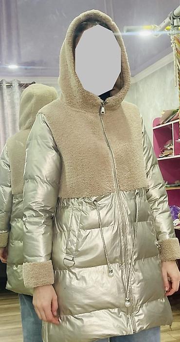 Женская парка пуховик, размер 48,мех на капюшоне натуральный,съёмный,состояние идеальное, находится в Кара Балта цена 2500. (покупали за 7000)