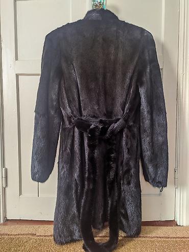 Шуба из натурального меха (визуально — норка), темно-шоколадного/чёрного оттенка.