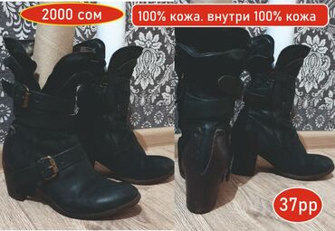 1) невысокие чёрные сапоги деми из 100% кожи (внутри тоже кожа). Декор — ремни с металлическими пряжками. Устойчивый каблук средней высоты. Размер: 37. Цена: 2000 сом. идеальное состояние.